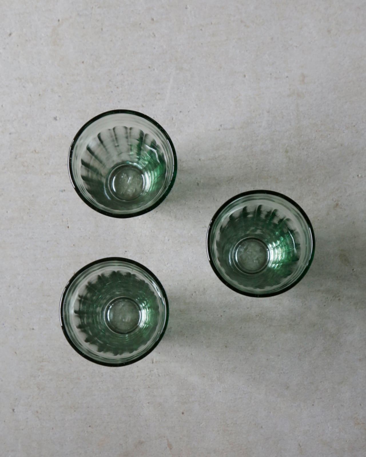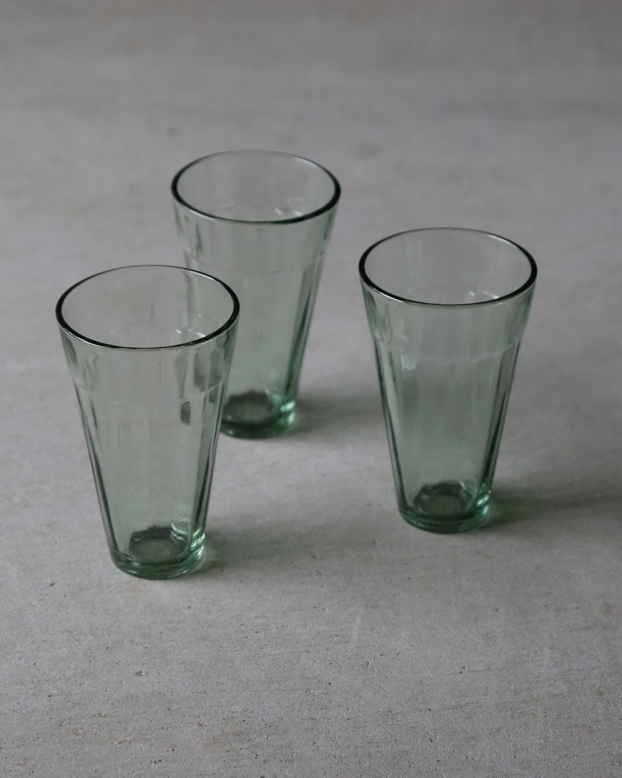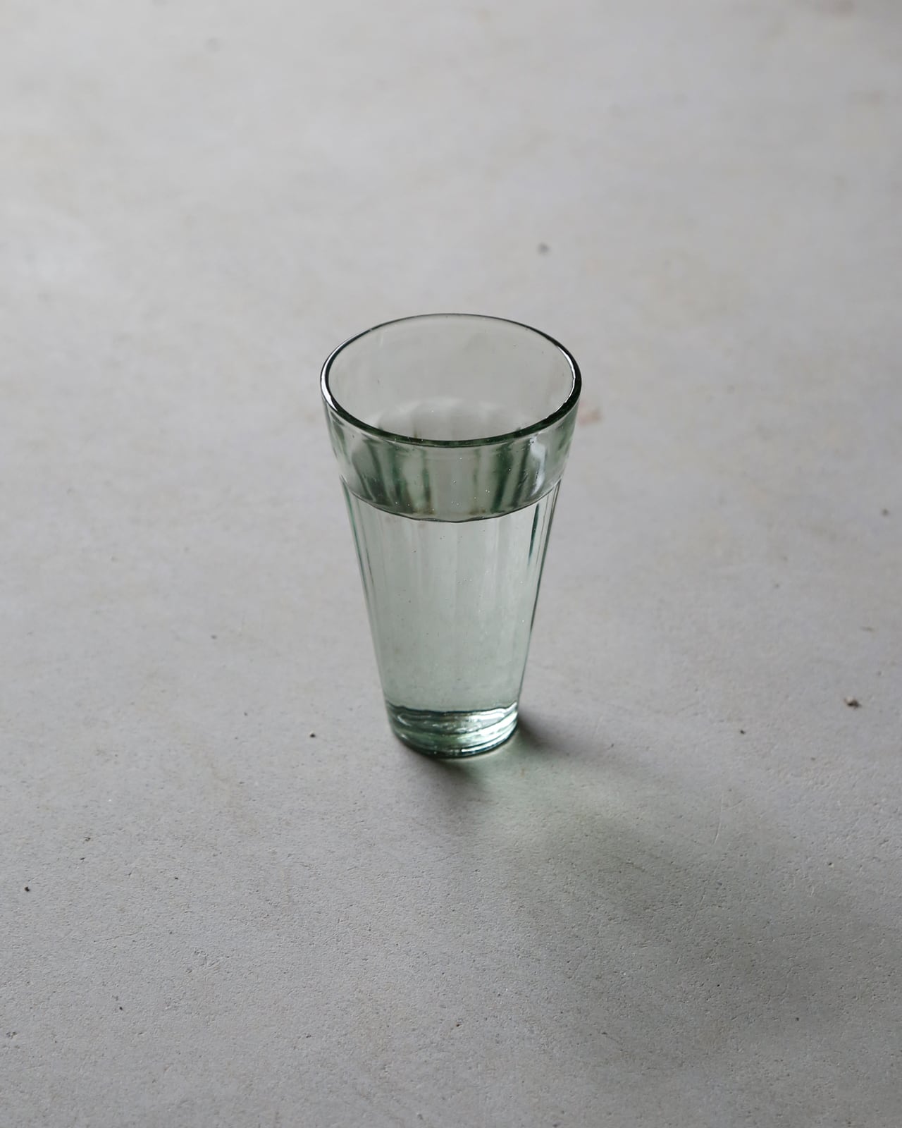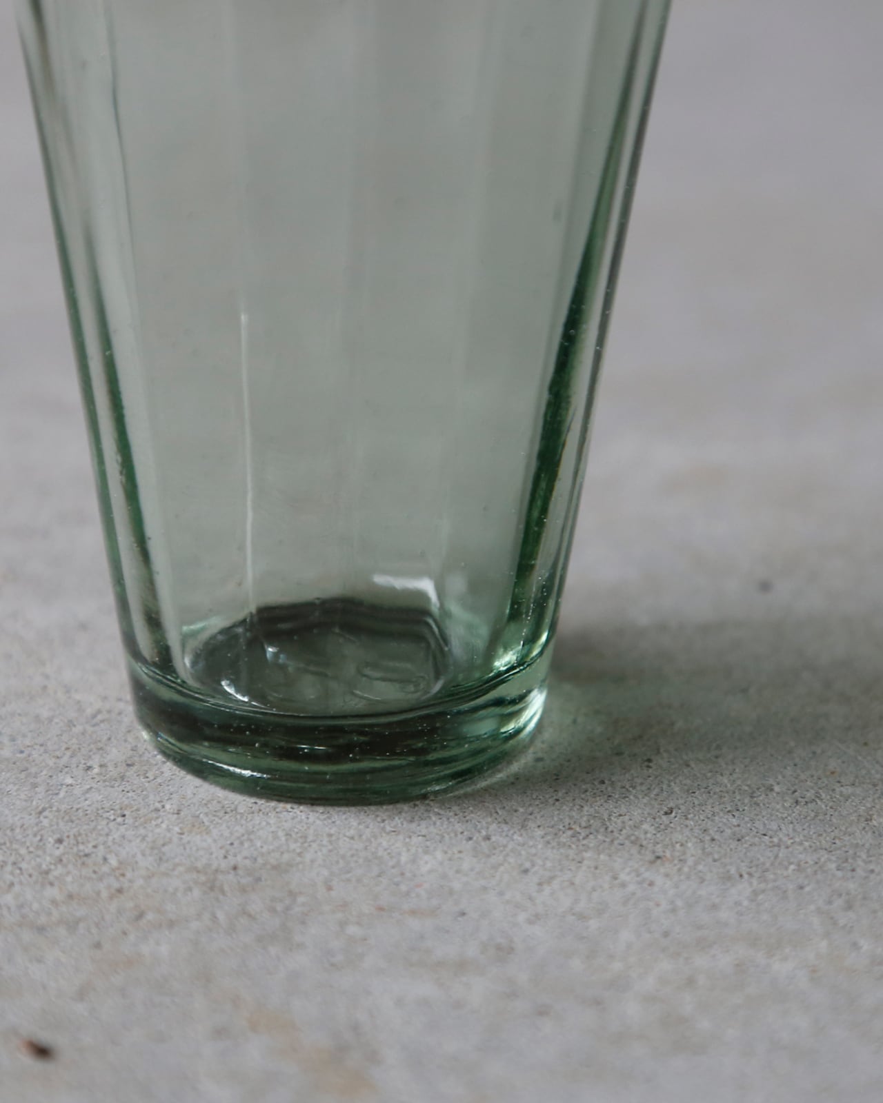 インドのチャイグラス。 深海の底から空を見上げるような、ブルーグリーンの世界。 水を注ぐと、まるで星の味がしそうな光が広がります。 底が小さい特徴的な形は、庭の草花を生けても絵になります。 冷たい水やジュースを注いで、光をお楽しみください。 ※耐熱グラスではございませんので、ご注意ください。 ※インド製品の特性上、小さな気泡や細かな傷が見られる場合があります。 それぞれ少しずつ異なる表情をお楽しみください。 ◾️サイズ 直径(飲み口):約6.5cm 直径(底):約3.3cm 高さ:約11cm