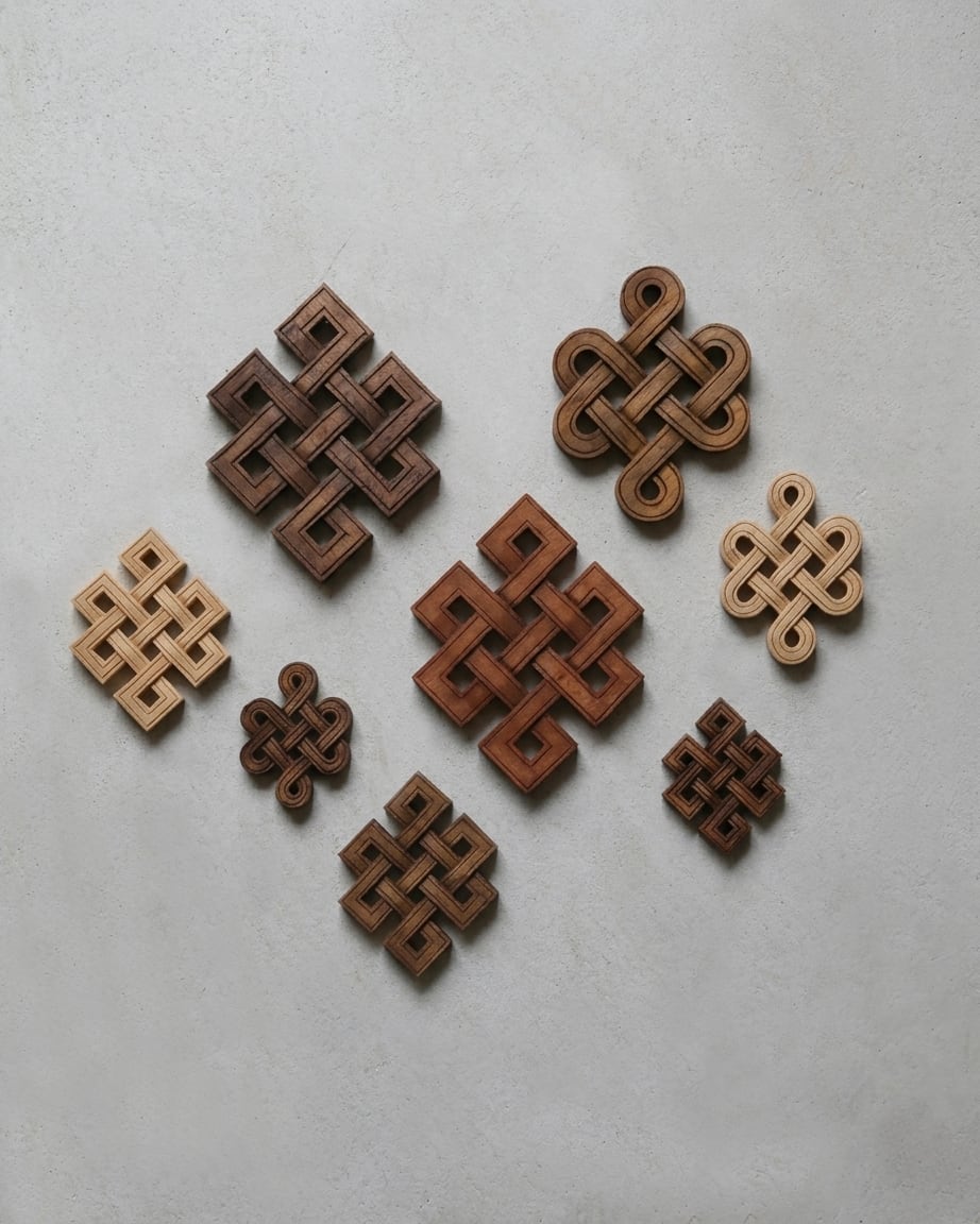 木を彫ってかたちづくられたチベットのモチーフ、エンドレスノット。