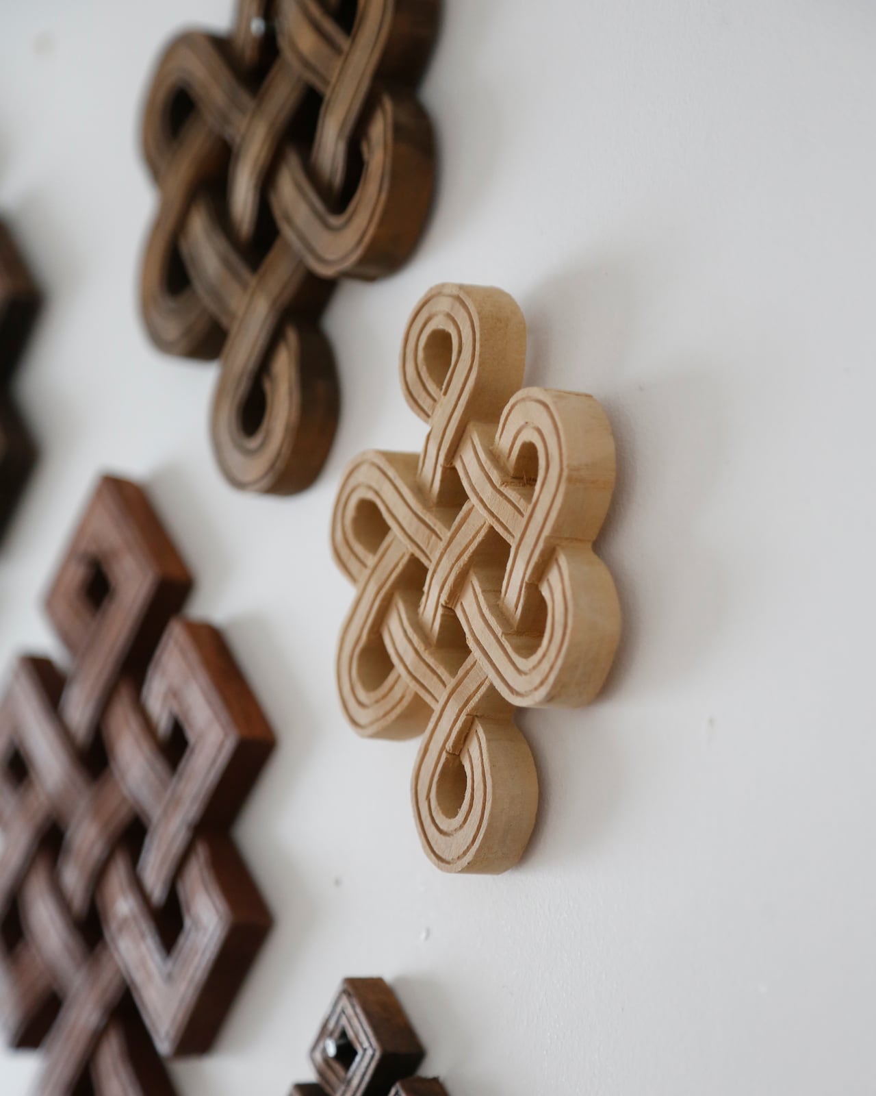 木を彫ってかたちづくられたチベットのモチーフ、エンドレスノット。