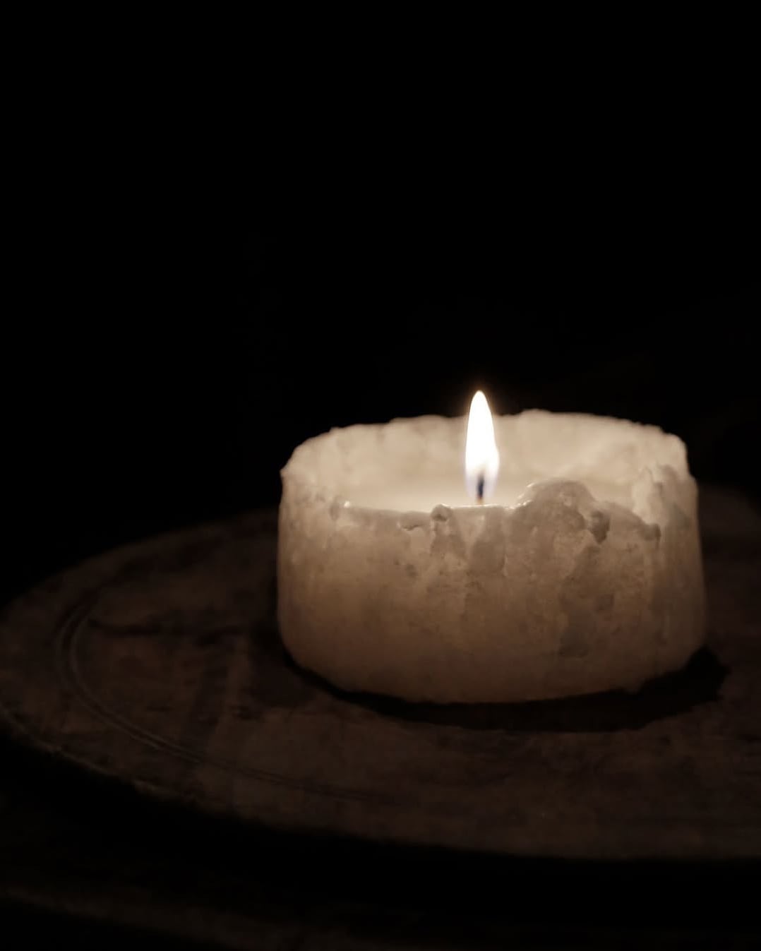 手捻りで作られたうつわのように、一点ずつ形の違う、”火のうつわ” 火を灯すと、蝋が透明感を帯び、繊細な姿が浮かび上がります。 それはまるで雪を固めて作られたかのようにも見えます。 夕食後のいつもの時間。 ちょっといいお酒なんかを飲みながら。 美しく”雪”が溶けていく様子をお楽しみください。 ・ 大きさ:直径10cm程度 ご注意:それぞれ個体により少しずつ形が違います。どのような形がいくかはおまかせとなりますので、ご了承ください。